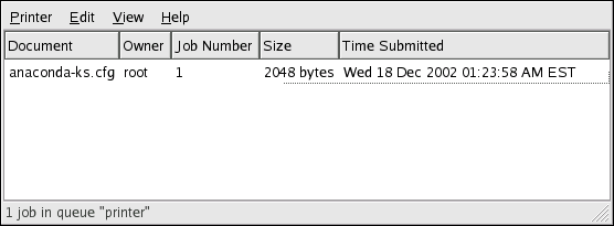 When you send a print job to the printer daemon, such as printing a text file from Emacs or printing an image from The GIMP, the print job is added to the print spool queue. The print spool queue is a list of print jobs that have been sent to the printer and information about each print request, such as the status of the request, the username of the person who sent the request, the hostname of the system that sent the request, the job number, and more.